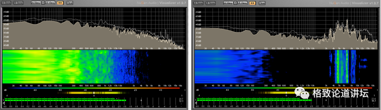 我们拿城市的声音和雨林的声音做了一个对比,左边的是城市的声音,右边是雨林的声音,你会发现城市的声音是非常没有规律,是一大片过去的,但是雨林的声音在我刚才说的中高频有一个凹陷,那个频率是对生物非常重要的频率。