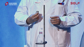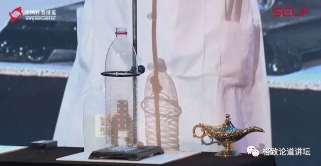 这个化学反应是,双氧水分解变成水和氧气。你看到氧气出来了吗?错,你看到的不是氧气,因为空气中有氧气,是看不见、摸不到的。大家看这个瓶子,瓶子已经开始缩小了,所以一部分的水变成水蒸气。你看到的是水蒸气,也有你看不到的氧气,所以这是一个典型的化学反应。