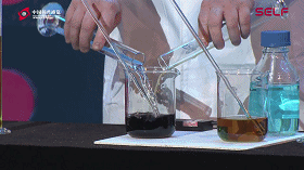 我们在别的化学反应看看,有没有催化剂的作用。这里有两个液体,上过化学课的人应该知道,这种颜色的液体应该含有哪个金属离子呢?就是三价铁,另外一个是硫代硫酸钠。我把两个液体倒在一起,我们看有没有化学反应。