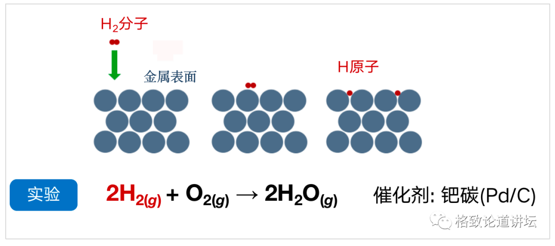 钯为什么会促进氢气反应呢?因为氢和氢的化学键很强,让它参加化学反应,活化能很高,需要吸收大量的能量。但是把氢气分子吸收在金属钯的表面,它会分开变成氢原子,现在这个氢原子的反应速度很快,所以我们可以用一个含钯的催化剂。