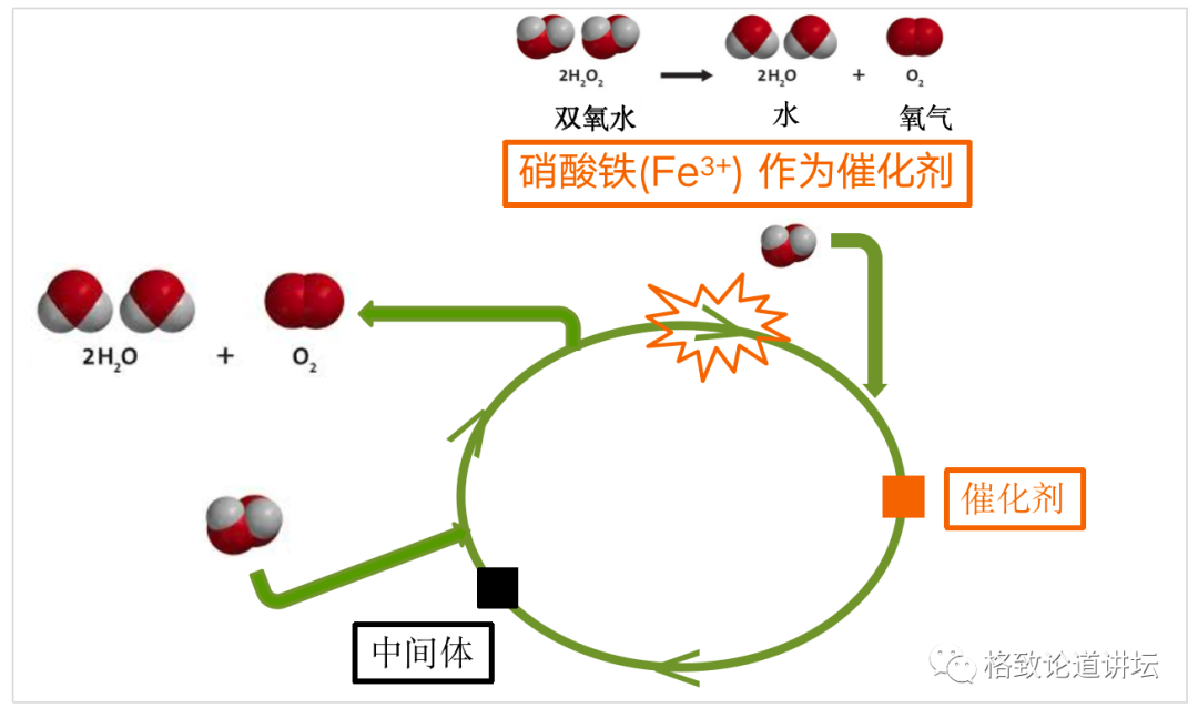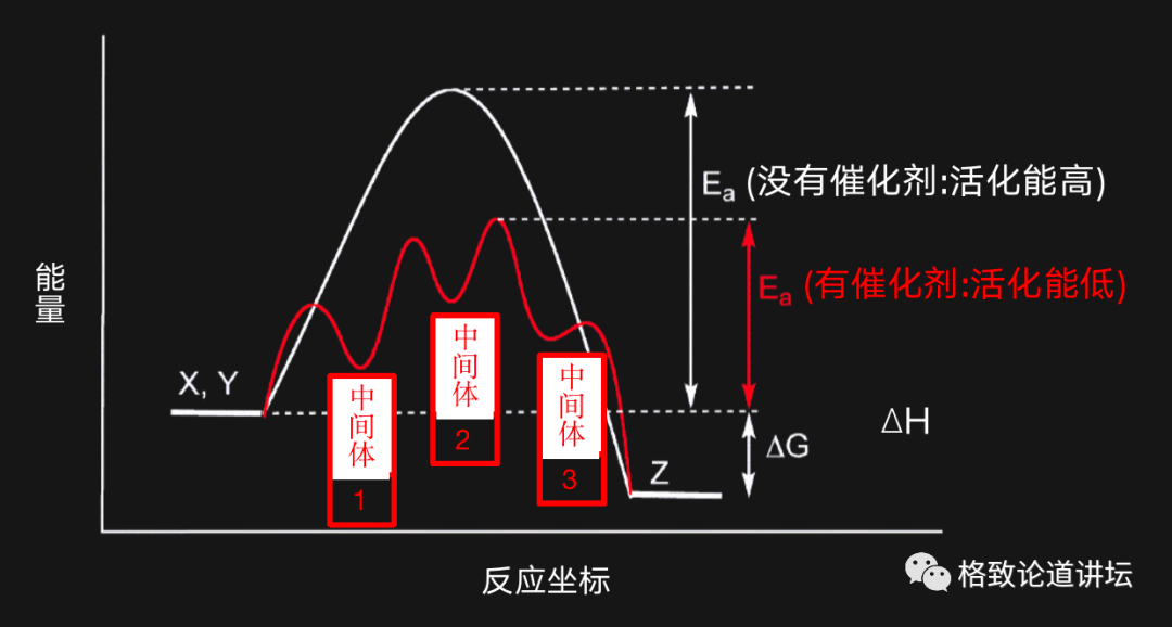 很多同学上化学课的时候会经常犯错,说催化剂不参加化学反应,这是不对的。因为刚才我们知道它是参加的,它会变成一个中间体,但是反应结束了,这个中间体恢复成原来的催化剂。