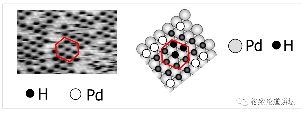 有实验证据可以用一个扫描隧道显微镜,能看到这个黑点就是氢原子在金属钯的表面,结构模型就是这样一个六方体。