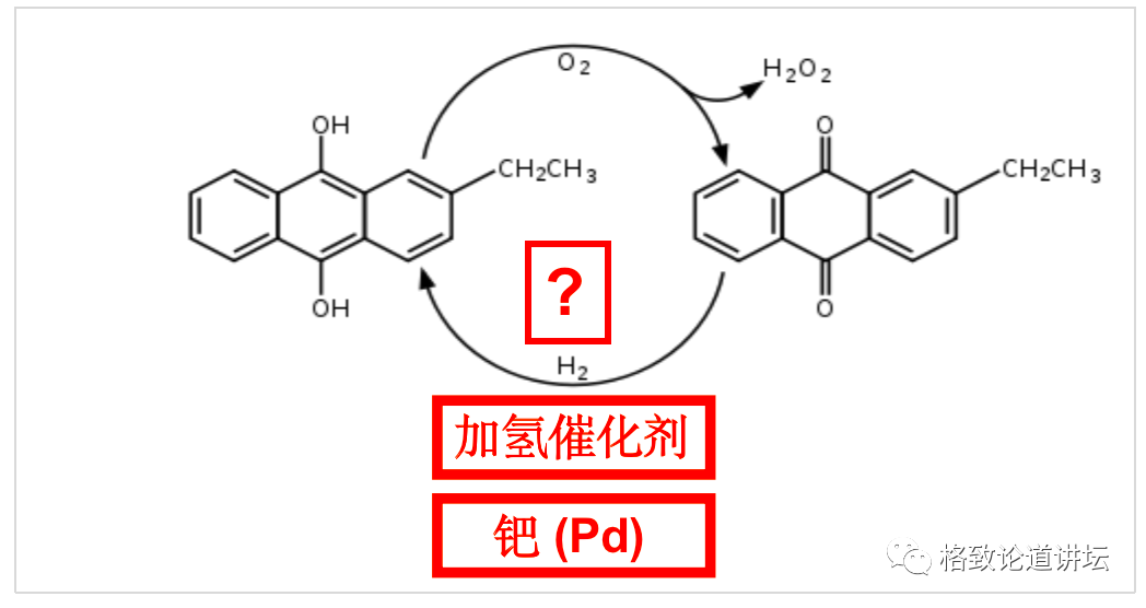 有一个有机化合物,叫蒽醌,它在空气中被氧化了变成双氧水。这个有机化合物要循环用,不循环用是不环保的,要加氢成本太高。有机化合物和氢气反应速度非常慢,怎么把反应速度提高?加催化剂,一个很好的加氢催化剂就是钯Pd,我们可以把钯作为催化剂。