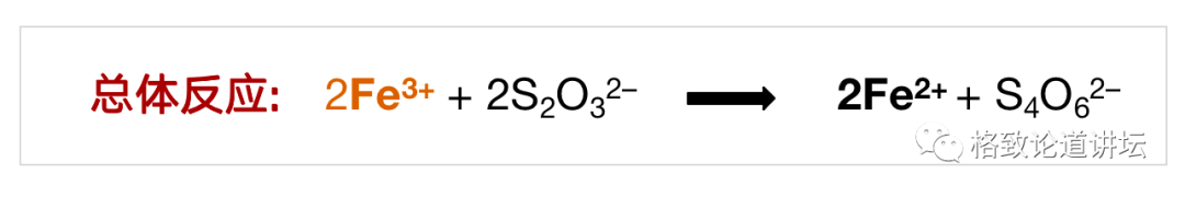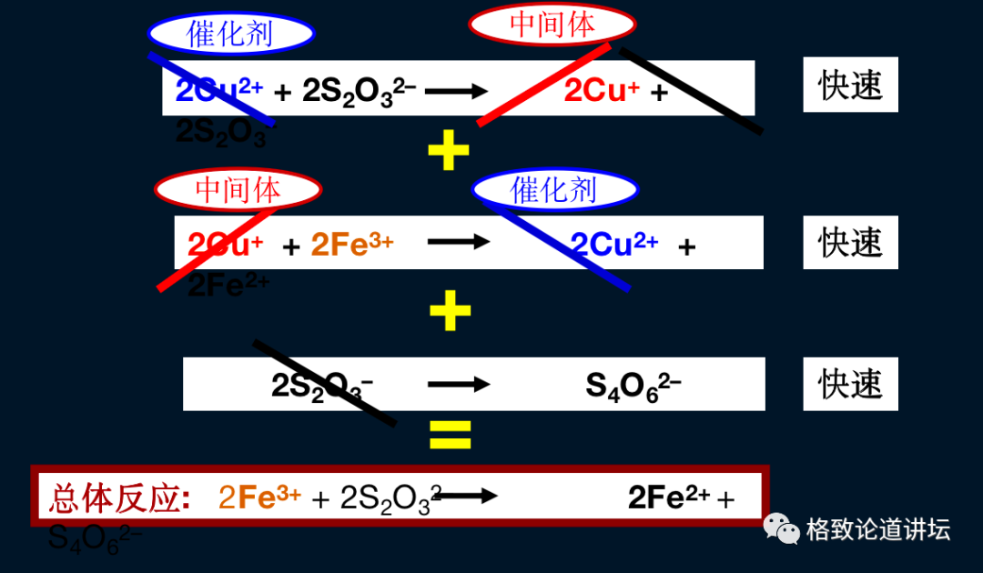 中间体是什么?就是一价铜。二价铜它会变成一价铜,但是最后一价铜恢复原来的催化剂,但是你把这所有的化学反应式加在一起,可以把催化剂、中间体删掉了,总体的反应就是原来的三价铁和硫代硫酸钠,变成二价铁和连四硫酸根。但是因为这个反应速度很快,所以总体的反应速度比没有催化剂快得多了。