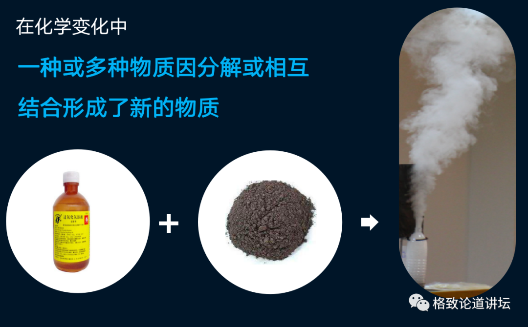 刚才我们有两种物质,双氧水在药店可以买到,有的人用双氧水消毒;也有二氧化锰,两个物质放在一起,会产生一个新的物质,就喷出来雾。