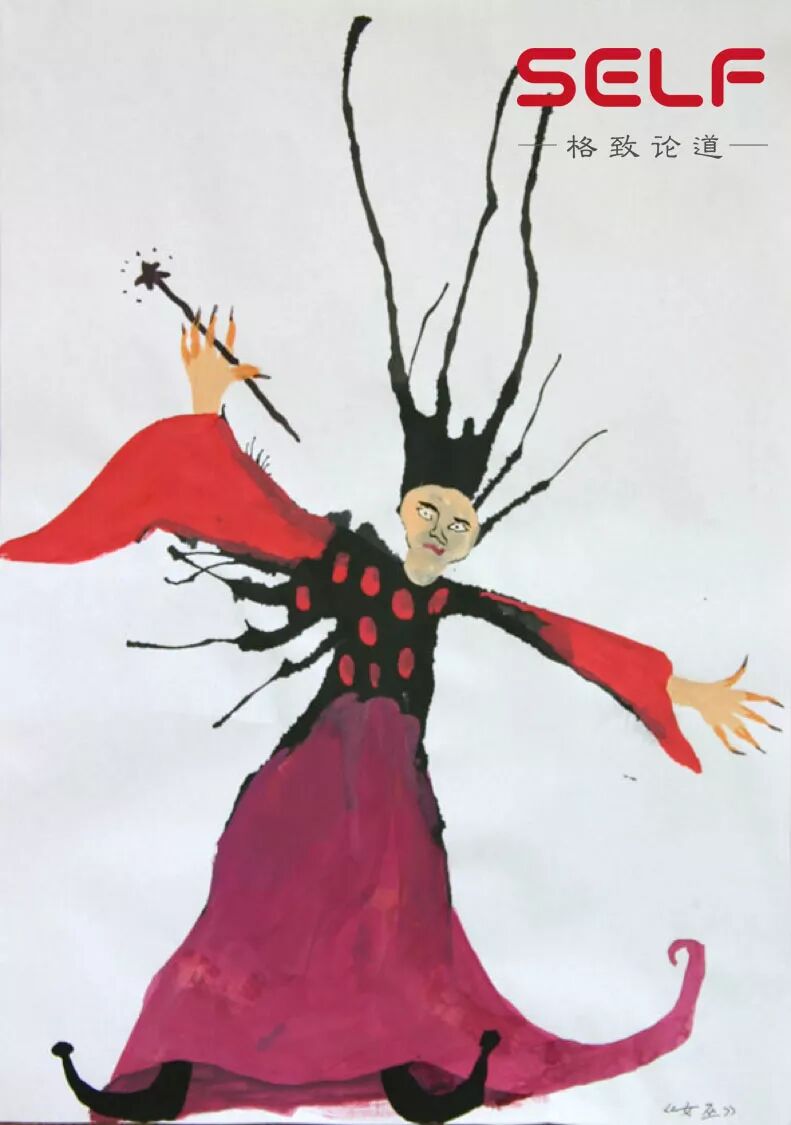 而这个孩子在万圣节前夕,要送一个女巫给他的朋友。因为他发现他吹出来这个墨团挺像一个女巫的样子,于是他把它画成了这样。