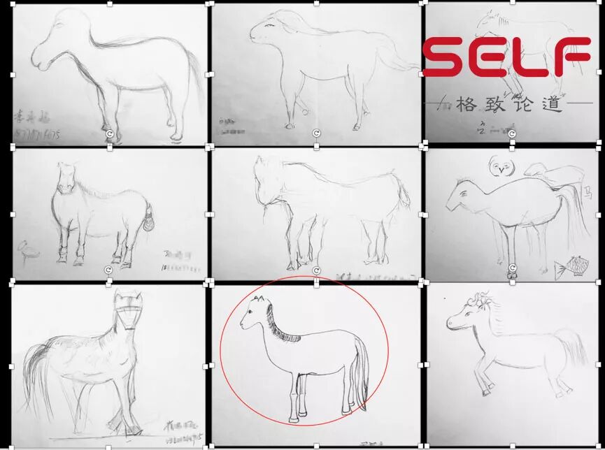 这是我收集的美术专业大学生们画的马,这里面其中有一匹马是一位从来没有受过美术专业训练的成人画的(图红色圆圈内),她是一个孩子的妈妈。其它这些马画的跟这位家长画的区别大吗?我觉得这位家长画的马更加可爱、更加有灵气,眼神里透着一种萌萌的感觉。