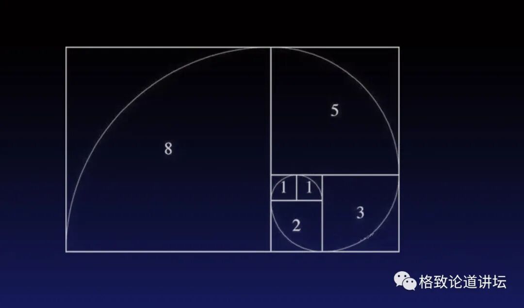 图中长方形与正方形的比例是黄金分割比例。我们再把正方形里面的内接弧线拼接起来就形成了一个螺线,也就是斐波那契螺线。
