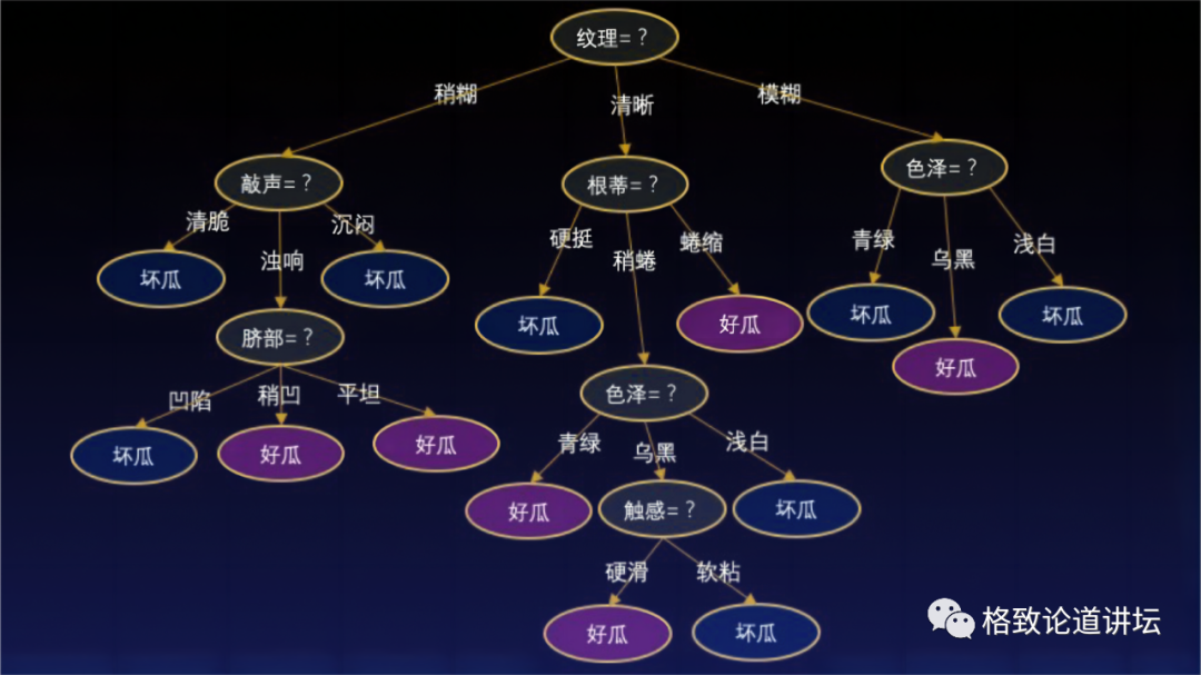还可以通过对一车西瓜进行学习,学习它的颜色、纹理、敲起来的声音,然后做出一棵挑瓜的决策树,给我们吃瓜群众挑一个又甜又大的西瓜。