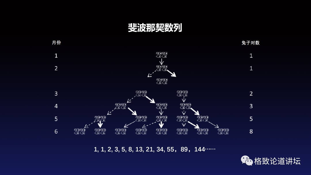 中世纪,意大利数学家斐波那契发现了一个很有意思的规律,比如有一对兔子,这对兔子从第三个月开始每个月会生一对小兔子,然后小兔子从它们的第三个月开始每个月又会生一对小小兔子,子子孙孙无穷尽也。