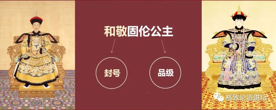 我这里以乾隆皇帝和他最爱的原配孝贤皇后所生的女儿“和敬固伦公主”为例。“固伦”是她的品级,清朝公主分两个等级,皇后所生的女儿封为固伦公主,其他所有妃嫔生的女儿封为和硕公主。那前面的“和敬”就是她的封号,等她到了十四五岁要出嫁时,皇帝才给她一个封号。