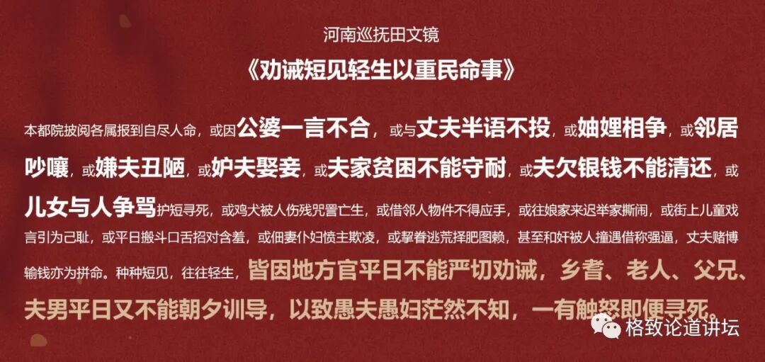 因为大家看这里的矛盾,什么公婆一言不和,丈夫半语不投或者和邻居发生了一点吵嚷等等。难道婆婆管教一下儿媳,丈夫管教一下妻子,不是应该的吗?怎么还能导致自杀呢?这不是对三从四德的儒家伦理准则的严重挑战吗?所以他才发这样的告示劝阻和禁止女性自杀。