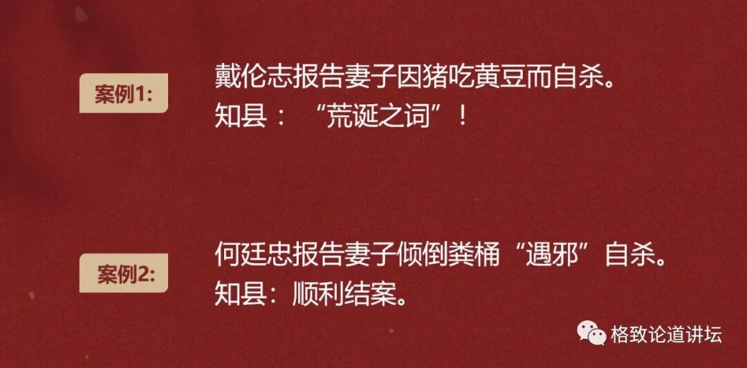 我在这里举一个例子,大家可以看第一个案例:四川巴县有一个叫戴伦志的,他报告说他妻子因为没有看好自己家里的猪,导致猪把所有黄豆都给吃了,于是情急之下自杀了。县官看完这个报状后,就在上面批道:荒诞之词!自己家的猪吃了自己家的黄豆,以至于跟一只猪置气而自杀吗?这不合情理,就把他的报状打回去,让他重新来报。