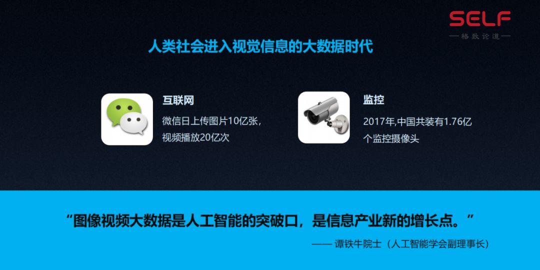 为什么我们会关注计算机视觉技术?事实上人类社会现在正在进入视觉信息的大数据时代,我们日常会使用微信,微信上每天上传的图片、分享的数频达到数十亿次。另外一个很大的视觉信息来源是监控摄像头。据估计,在我们国家已经安装了超过1.7亿个摄像头,每分每秒都会有大量数据的产生。