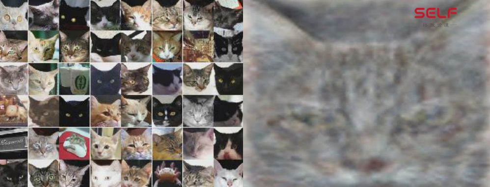 左边给出的就是被这个算法判断为猫的例子,其实仔细看就会发现里面还是有些错误的,右边是这些图片的平均照片,确实这个算法识别出的大部分都像猫,也确实是猫的照片。