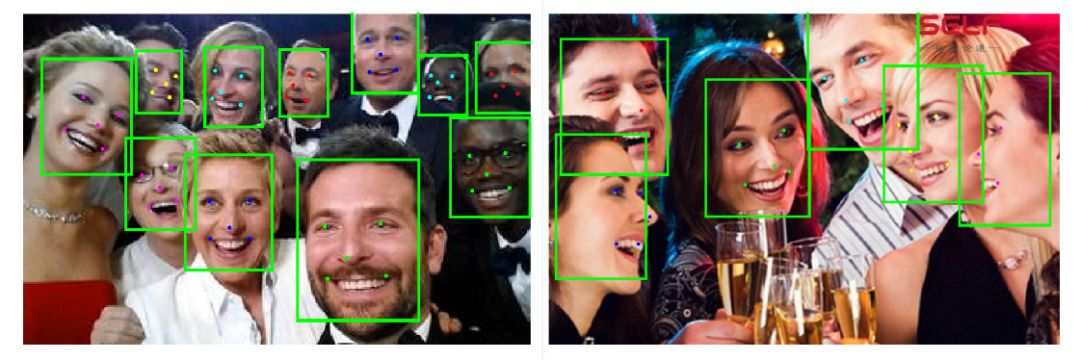 这是我们的算法在人脸检测中所做的效果,我们可以看到现在的算法对于不同的肤色、不同的表情以及人脸姿态的变化,都有非常强的鲁棒性。我们的算法不仅能够找到人脸,还能同时发现你的眼睛、鼻子、嘴角的位置。可能有人会问,发现这个有什么意义吗?
