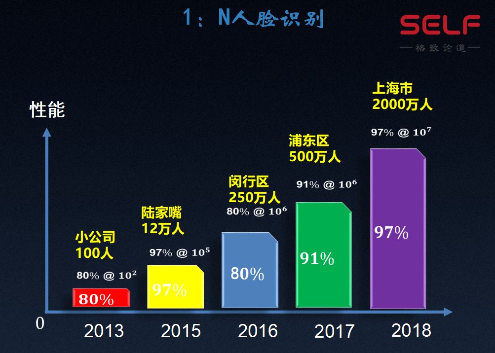 我们也可以体会一下这个技术的应用范围。2013年的时候,可能就应用在一个几百人的小公司,每天员工打一次卡,可以保证没有什么错误。到2015年,可以做到上万人,比如上海的陆家嘴街道大概有十几万人的户籍人口,在这个范围内也有比较好的识别率。到2016、2017年的时候,我们已经可以处理一个拥有几百万人口的比较大的区。