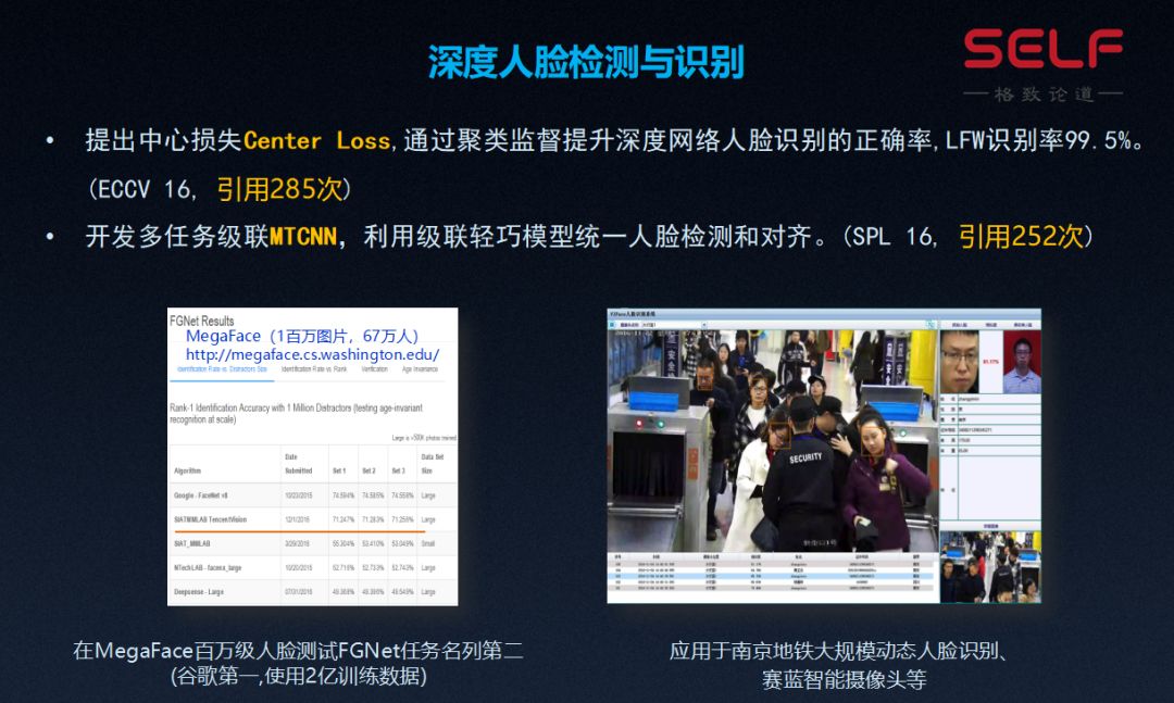 同样我们的技术也跟一些企业合作,像南京地铁的大规模人脸识别,还有一些智能的服务摄像头等应用。除了人脸识别,我们还做很多事情,包括从视频中去识别人的行为,在这件事情上,我们的很多技术也在像商汤科技这样的大型企业得到了比较广泛的应用。
