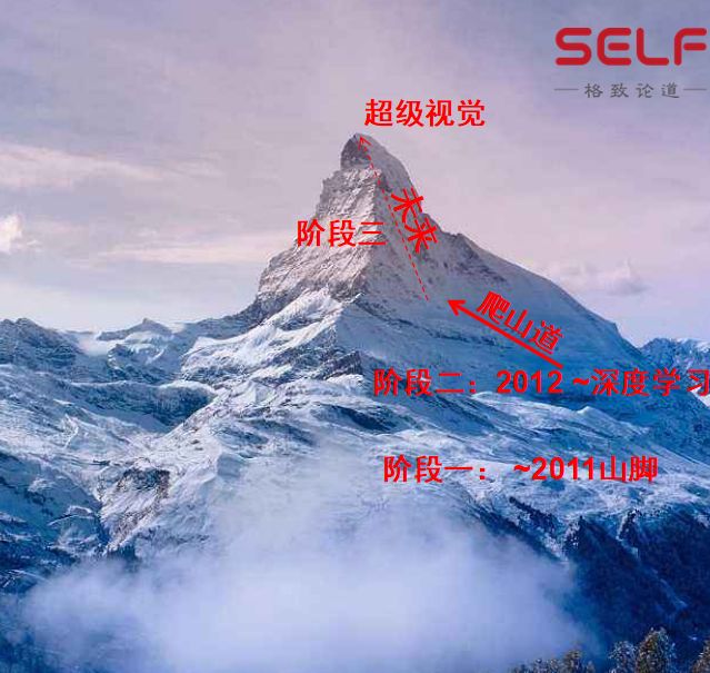 我经常用这幅图来比喻我们的任务,这座山的顶峰是我们的目标,就是要建立和人类匹配,甚至超过人类的超级视觉能力。我的目的就是登上这座山的顶峰,遗憾的是在很长的时间里,比如在2011年,我感觉我只能在山脚到处寻找,离山顶非常之远,那时候我们只能通过一些方法很局部、很微弱地推动技术的进步。