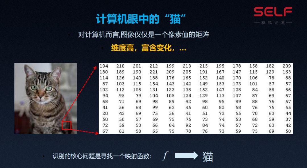 我们知道计算机是把图片中每个像素的RGB,也就是红、绿、蓝三个通道的值存储下来。对计算机来讲,一张图片就是一个巨大的像素的矩阵,每个点的位置是这个点的色彩值。那么我们要解决的核心问题就是要找到一个映射函数,把一张图片映射到猫的概念,这个问题的挑战就在于我们输入的维度很高,可能上千万维,里面又包含着色彩的变化、姿态的变化、光照的变化、猫的数目的变化等等非常复杂的变化,这些就是我们要解决的挑战。