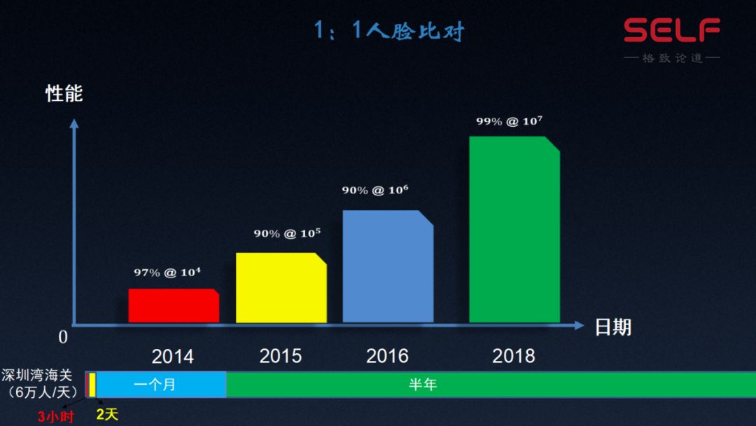 深圳湾和香港相邻的地方有一个深圳湾口岸,是中国最大的单个的海关通关口岸之一,每天大概有6万人通过。在2014年的技术水平下,用这个技术,大概每三个小时会错判一次,就是说每三个小时就可能有人用假证件混过去一次。在2015年的技术水平下,每两天会错判一次。到2016年的时候,,可能一个月这个系统才会错判一次。到2018年,采用我们最新的技术,大概半年才会错判一次。
