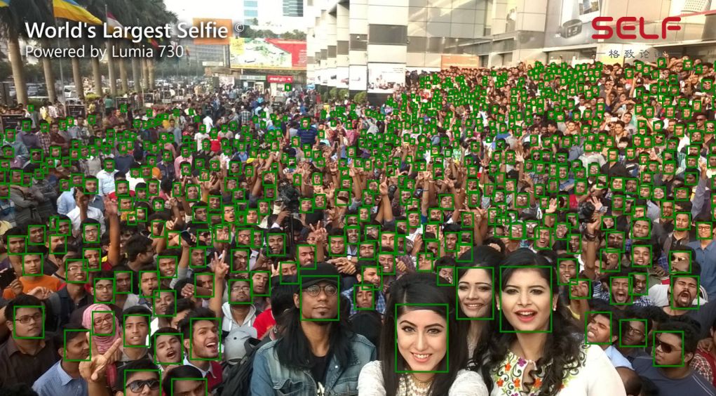 大家能不能猜一下,这张照片中有多少张人脸?计算机发现了接近800张人脸,而且这件事情可以做得非常快,只需要不到一秒钟的时间。把照片送进计算机,它就会把人脸的数目和圈中人脸位置的框输出出来。找出人脸之后,我们就要进行人脸识别。