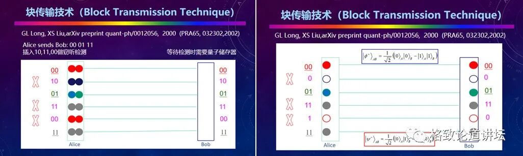 这是第一个协议,它就是利用纠缠对。只要不让窃听人同时拿到两个纠缠对,就能保证它的安全。我们直接把信息加载在EPR对里边,为了不让窃听的人拿到,分两步传输。第一步我们运用块传输技术,先把其中一个传过去,插入几个窃听的光子对做测量,再比对一下,这样我们就能发现有没有窃听。确认在第一队传输的时候窃听者没有拿到后,我们再把另一个传过去。把两个都拿到了以后放在一起测量,就可以得到信息了。这样就实现了可靠和安全通信。