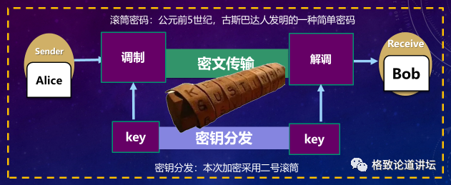 这里还有一个密码,它经过另外一个信道“密钥分发”来传输。在这里,密钥相当于滚筒的型号。一般来说,密钥分发用非对称密码算法完成,比如AES(高级加密标准)和“一次一密”。所有经典密码中,只有“一次一密”被证明是绝对安全、不可破译的。