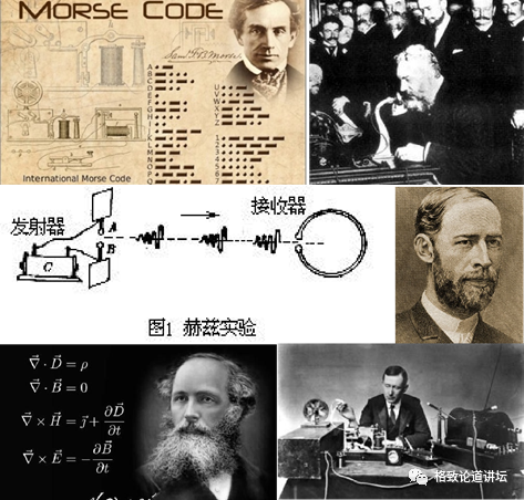 下左:麦克斯韦方程 下右:马克尼与无线电
