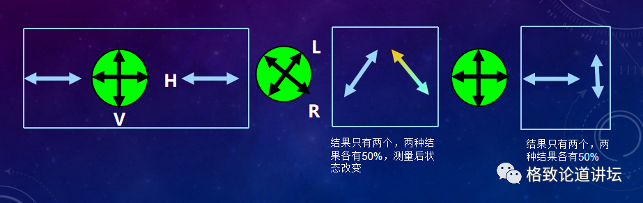 现在反斜杠的这个再进一个“加号”的测量仪器,它又会出现结果随机,对吧?有可能是水平的、也可能是垂直的。这是什么意思呢?就是说这个水平的东西,如果中间没有被人捣乱、没有被人窃听,那么再用“加号”测量的话,它应该还是水平的。但是中间如果有人窃听了,而且拿了个“乘号”的测量仪器,把它状态改变了的话,那结果就有50%的可能性出现错误。总是就是三个点:结果受限、结果随机,还有状态改变。