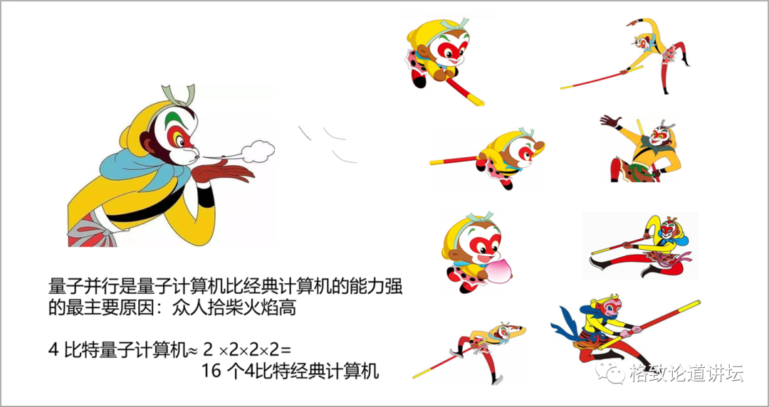 《西游记》中的孙悟空有个本事,他拔3根毫毛一吹就变成了3个孙悟空。而“量子孙悟空”的本事比经典孙悟空还要大,一吹能变成8个“孙悟空”,即2的3次方。8个孙悟空一块干活,肯定比1个孙悟空干活要快、要多。