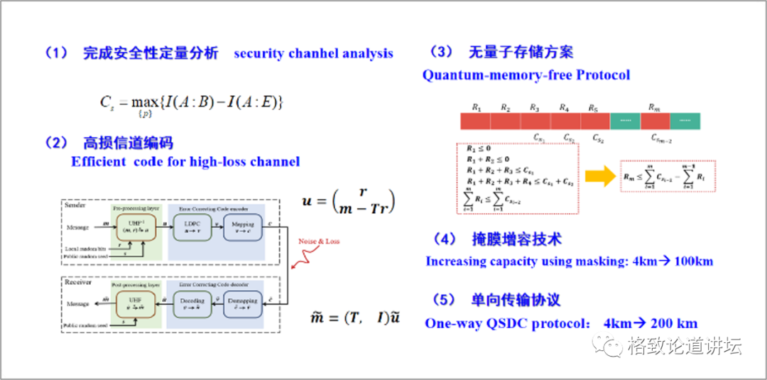 2016年以来,清华大学和北京量子院的联合团队合作,提出了5种关键技术,解决了量子直接通信实用化中的一些关键难题。这些技术包括:完成定量安全性分析、高损信道编码、无量子存储方案、掩膜增容技术以及单向传输协议。