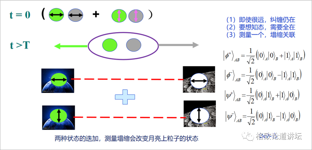 右边我写了三点。第一就是说即使分开很远,这个纠缠依然存在。我们把这两个光子一个放在地球上,一个放在月亮上,这时候已经拉得很开了,它们还是这种叠加状态。这种特性可以概括为“即使很远,纠缠仍在”。