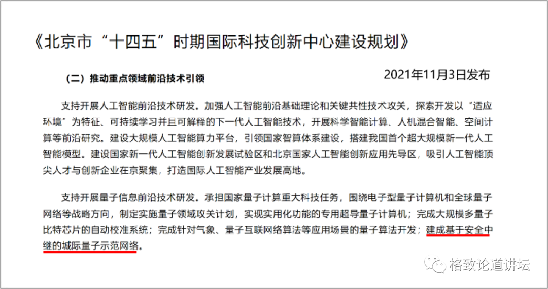 北京市在2021年11月3日发布了《北京市“十四五”时期国际科技创新中心建设规划》,明确提出重点支持开展量子信息前沿基础研发,将建成基于安全中继的城际量子示范网络。