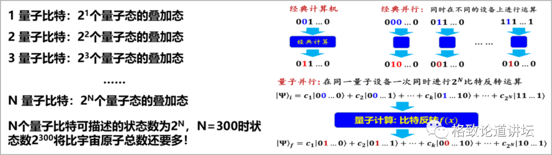 量子世界最后一个重要的特有性质是量子并行。两个粒子可以有00、01、10、11四种情况,在量子里可以做成叠加态,同时把四个状态表示出来,经典只能表示其中一种状态。有N个粒子就是2的N次方,可以把2的N次方同时表现出来。