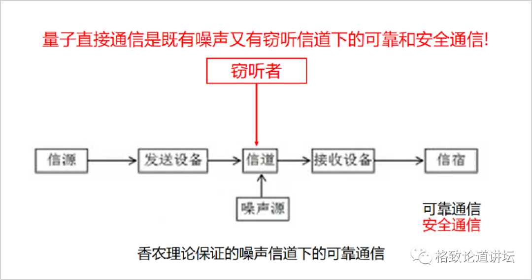 这张图中黑色部分是香农理论保证的经典通信,是噪声信道下的可靠通信。有量子直接通信后,现在即有噪声,还有窃听,仍然可以进行可靠和安全的通信。