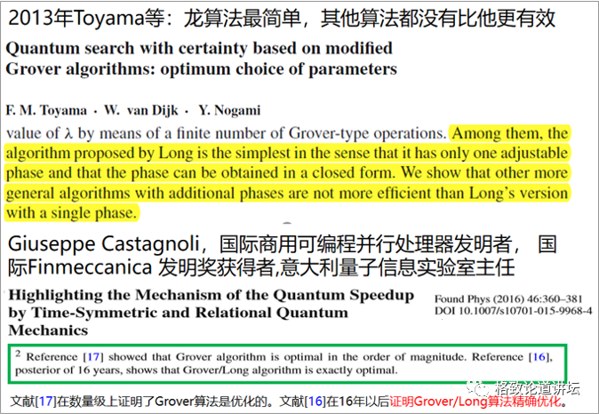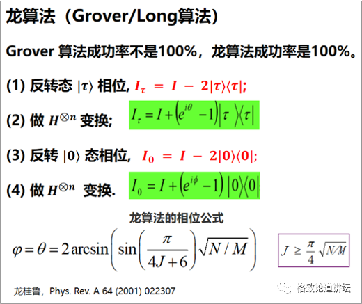 按照图上公式取这个角度,就能让Grover搜索的成功率达到100%。后来就有人把这个算法叫龙算法,或者是叫Grover/Long算法。量子计算提出人Benioff还有Grover都在他们的报告里肯定了我们的工作。