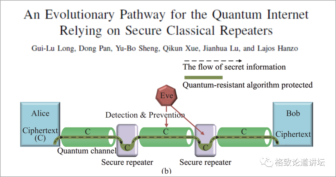 现在还没有量子存储,这使它的应用受到了限制。我们提出了安全中继,把量子直接通信和经典密码结合起来。利用量子直接通信传输经典密码加密的东西,在经典中继这个环节有经典密码保护。这样我们可以在整个网络里组网,网络中任意两个端点都可以进行安全通信。于是就可以在现有条件下组量子的网络,一直到以后有了量子中继,仍然可以并行使用。