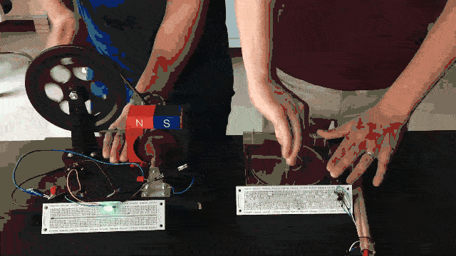 上图中左边的是电磁发电机,右边是摩擦纳米发电机。电磁发电机需要转得很快才能够带动一两个灯亮起来,因为它需要在高频率下才能供给高质量能源。