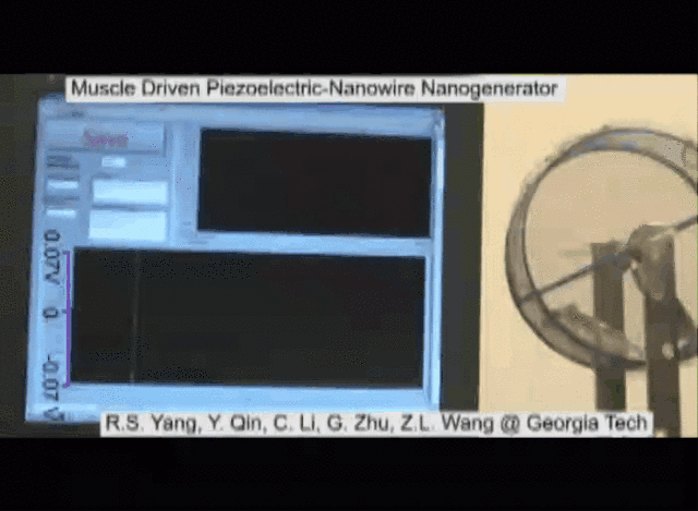 上图是我们第一次把单根纳米线放到人的手指上,用手指的动作来收集能量的情形。