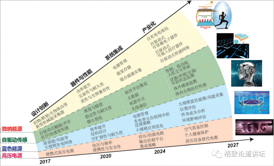 纳米发电机有四大应用领域,包括微纳能源、自驱动传感、蓝色能源以及高压电源。我们还提出了从2017年到2027年的纳米发电机发展技术路线图,这就有待年轻人投入这一行,使它发扬光大。
