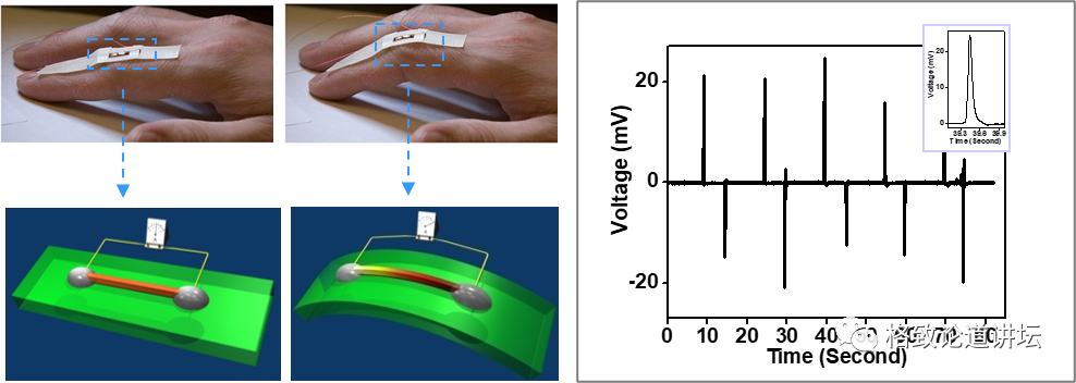 纳米发电机不光能输出能源,还能传感。我们利用摩擦纳米发电机做的传感器是自驱动传感,即不需要任何的放大和外界的功力源,只要触碰一下,它就可以实现信号的传输。