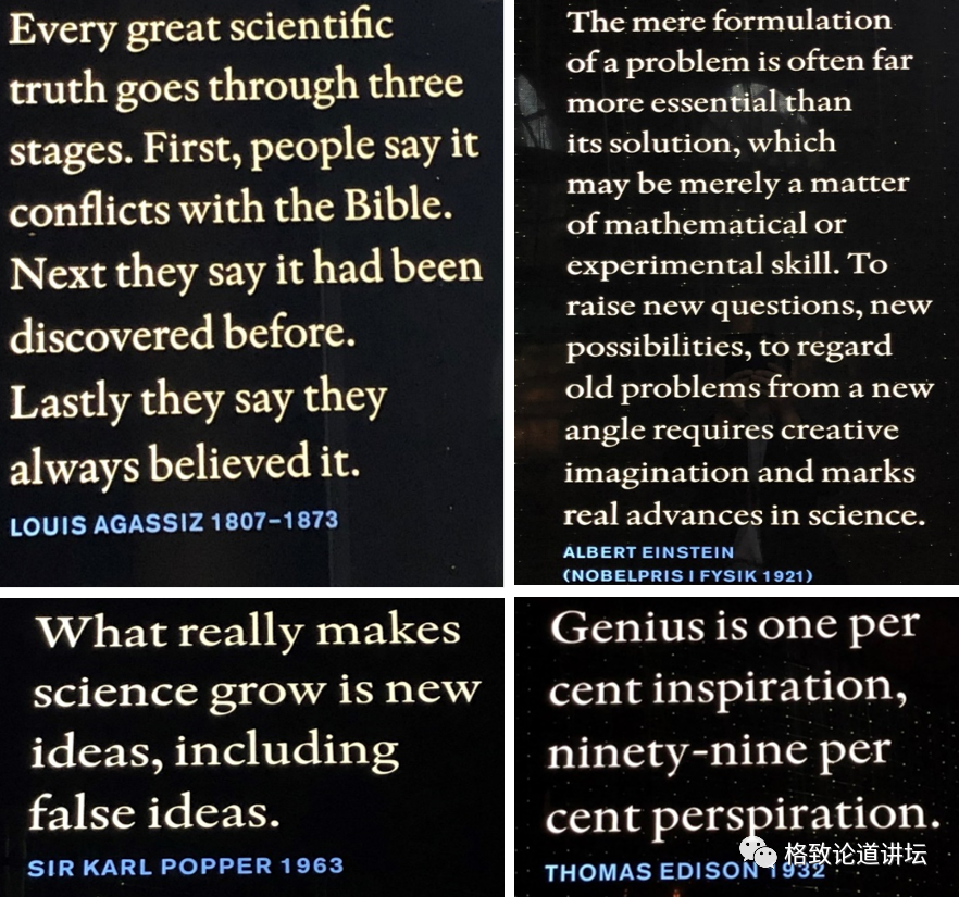 第一个条幅是19世纪的科学家路易斯•阿加西(Louis Agassiz)的语录。他说:“每一个科学真理都要经过三个阶段,首先人们说它和《圣经》相抵触;然后他们说它以前就被发现过;最后,他们说他们一直是坚信该真理的。”