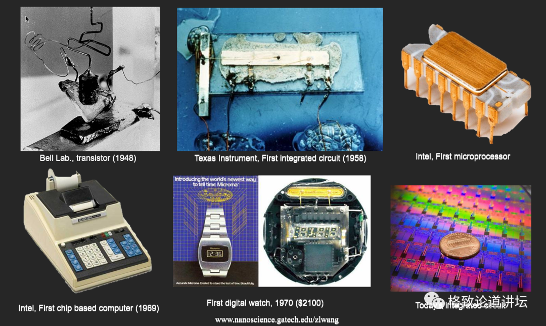上图展示了世界上第一个晶体三极管、第一块集成电路、第一个微处理器、第一个小计算器、第一块电子手表以及现在的集成电路。这些都是原创,它们给我们生活带来了翻天覆地的变化。