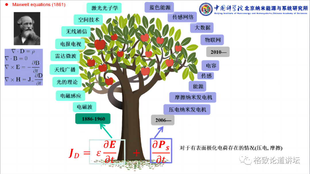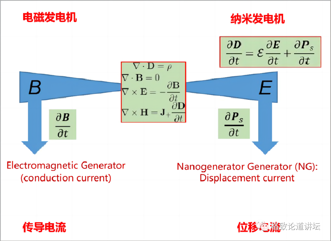 纳米发电机发明后,我们在2017年拓展了麦克斯韦方程组,以适应新时代能源理论,即电磁发电机用的是传导电流,纳米发电机用的是位移电流。