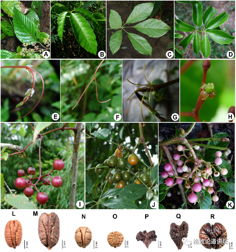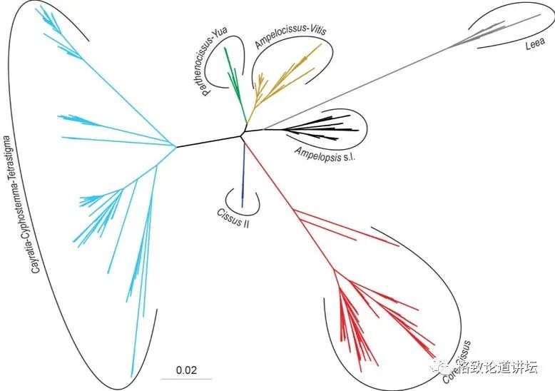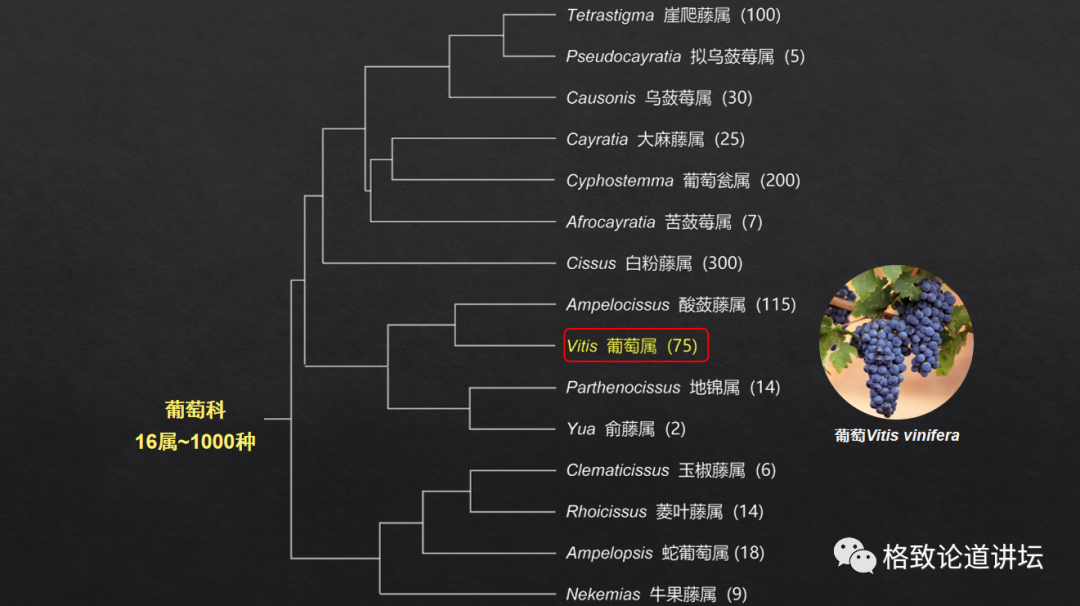 比如之前讲到的这些属,它们下面有很多物种。一般来讲,同属的物种的分子结果都要聚在一起。如果有一些物种跑了出去,形态又特别独特,通常我们会分出一些新类群。近几年,葡萄科已经分出了四个新属。