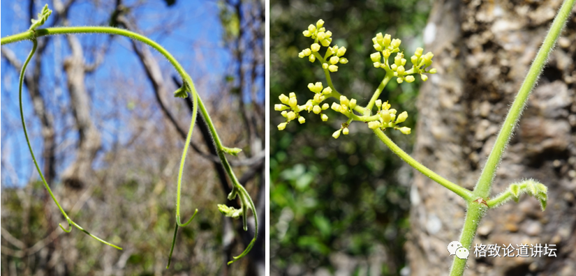我就激动地去找它的叶子。虽然当时是旱季,叶子很少,但还是找到一个小枝条。我们发现它的卷须和叶子是对生的,又看到哑铃型的花,说明它确实是葡萄科葡萄瓮属的。后来,向导也因为优异的表现被我们忽悠来植物所读博士了。