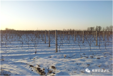 这是一个实验基地,正下着大雪。里面的葡萄不需要埋土也能过冬了,大大减少了人力物力的耗费,葡萄的品质也特别好,屡次获奖。
