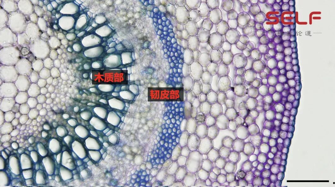 我们看韧皮部,这一部分也有很多比较小的管状细胞,这些管状细胞将养分从顶端合成的糖运输到植物下部。还有一些深蓝色的部分是什么?是纤维,也是起到支持作用的。所以从这张图可以看到,它其实跟现在人类建设的大厦非常相似。它们有各种不同的细胞,有的是管道状的,有的是房间状的,有的起到运输作用,有的起到储存作用。所以大树和大厦非常的相似。