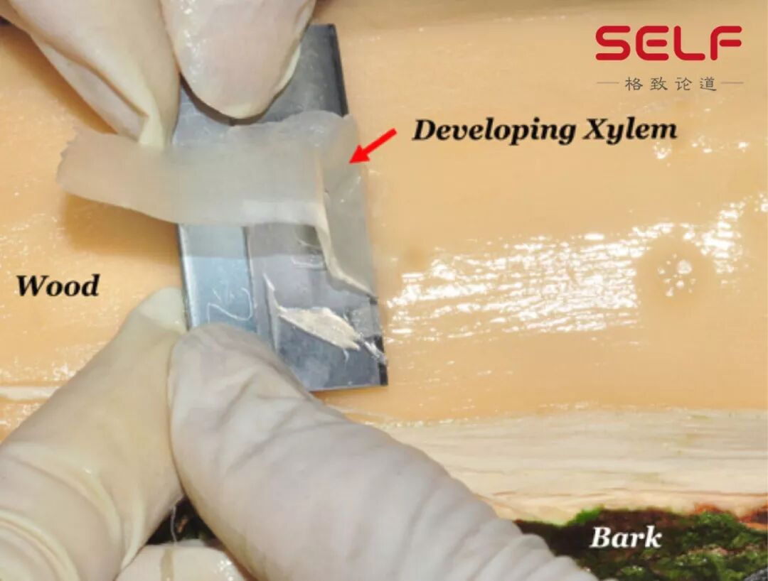怎么采集呢?首先把树皮扒掉,用这个刀片来割木材。木材它是活的,特别是这个时候你摸上去潮湿柔软,甚至好像带有温度一样,它是活的。然后刮下来这一条,就是正在发育中的木质部组织,跟我们吃的粉条一样晶莹剔透。这是一个活的组织。